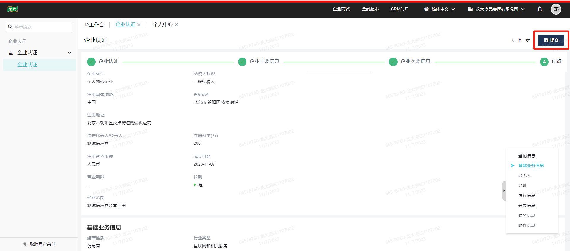4、企業驗證通過后,依次填寫企業主要信息、企業次要信息、預覽檢查無誤后,點擊右上角提交認證審核。注冊認證過程中如遇問題,可聯系甄云客服:400-116-0808解決,或與業務對接人聯系。
