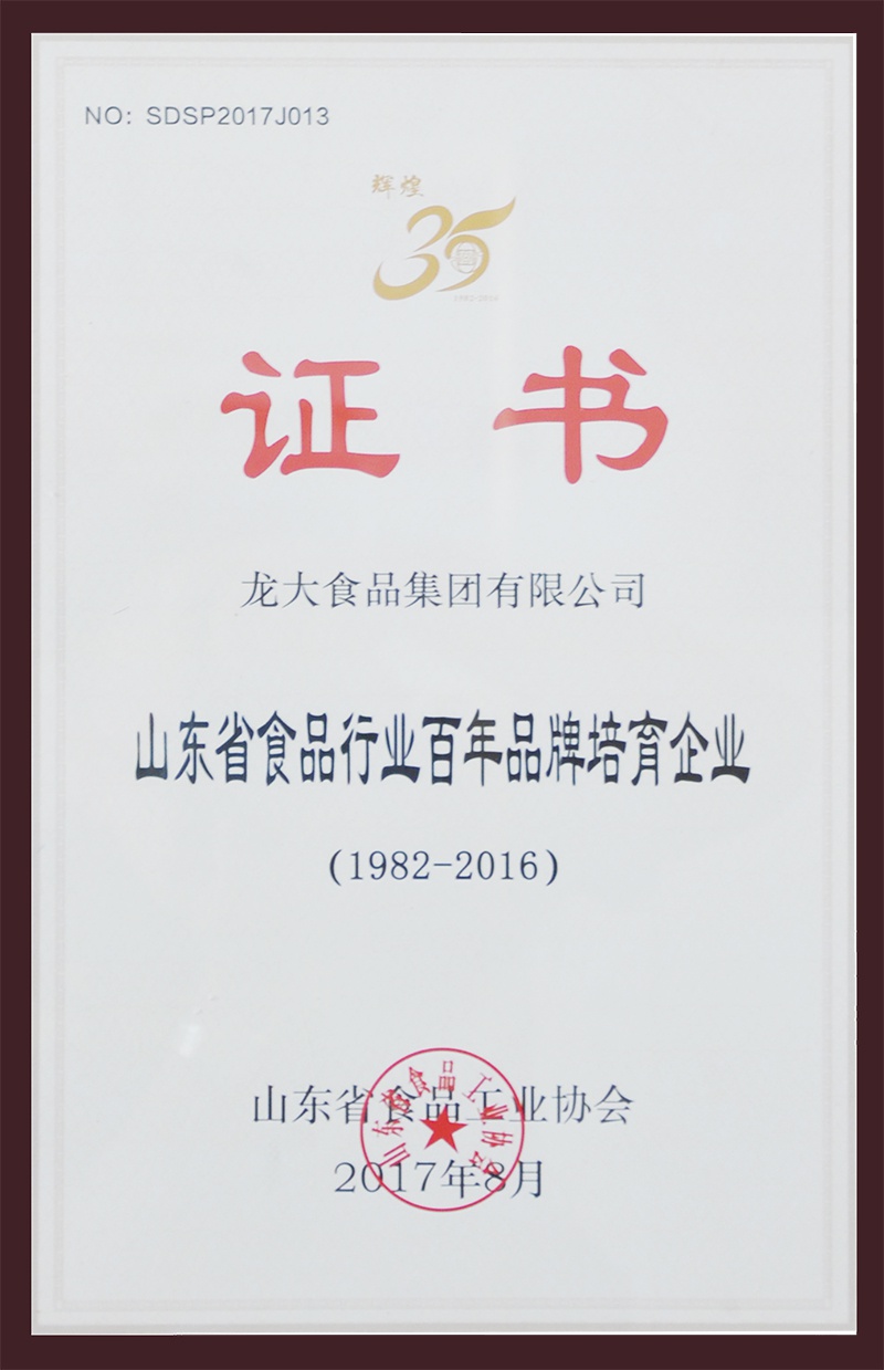 9月7日,山東省食品工業協會“輝煌35周年第八次會員代表大會暨產學研合作推動食品工業轉型升級高峰論壇”在濟南召開,龍大集團被授予“山東省食品行業百年品牌培育企業”榮譽稱號。